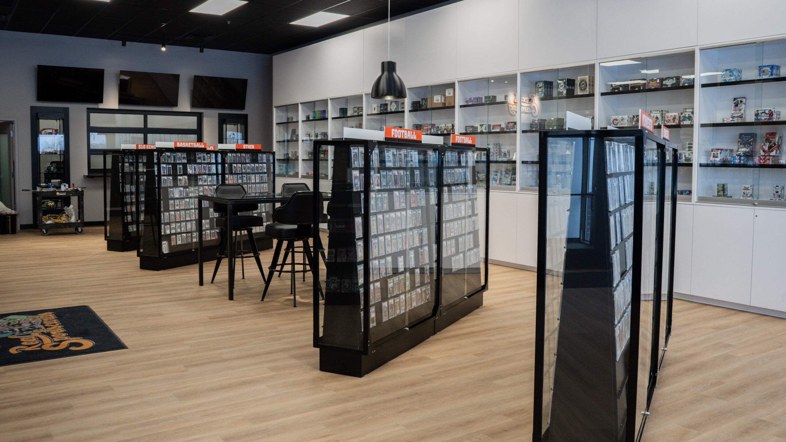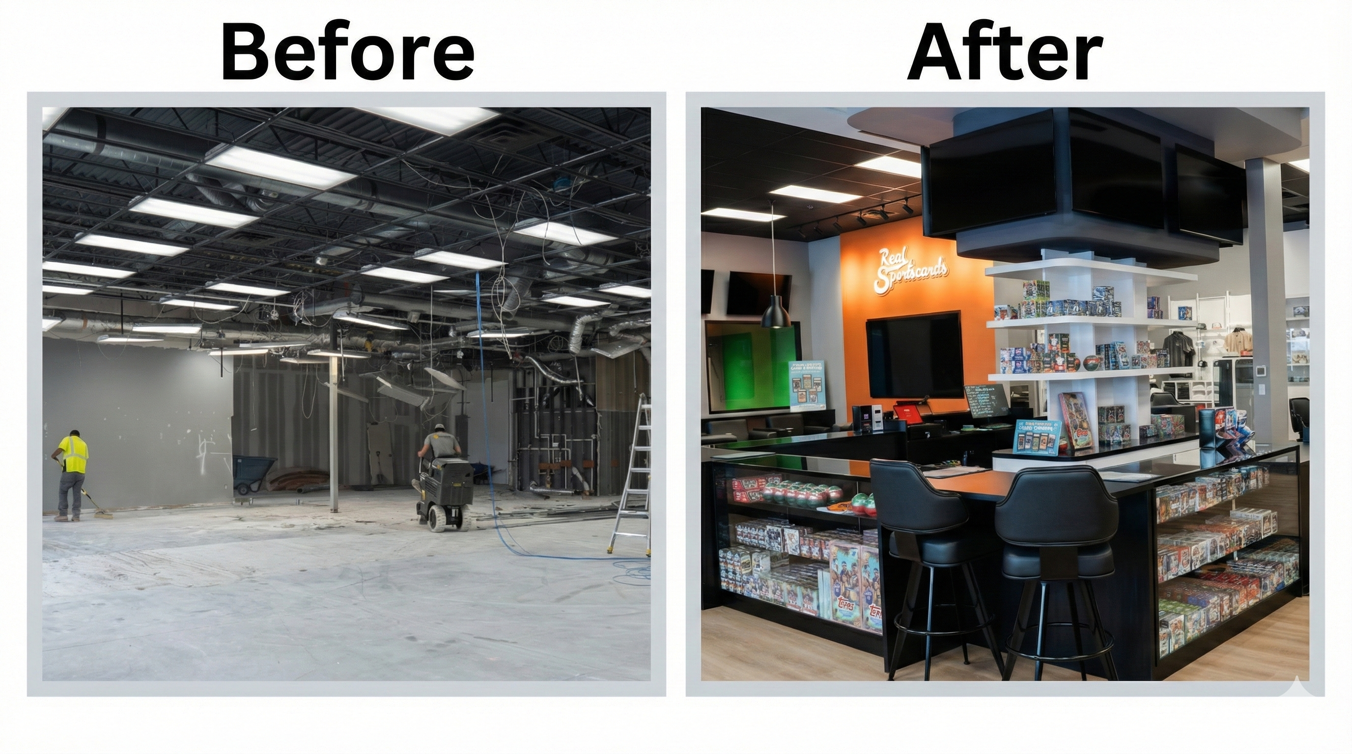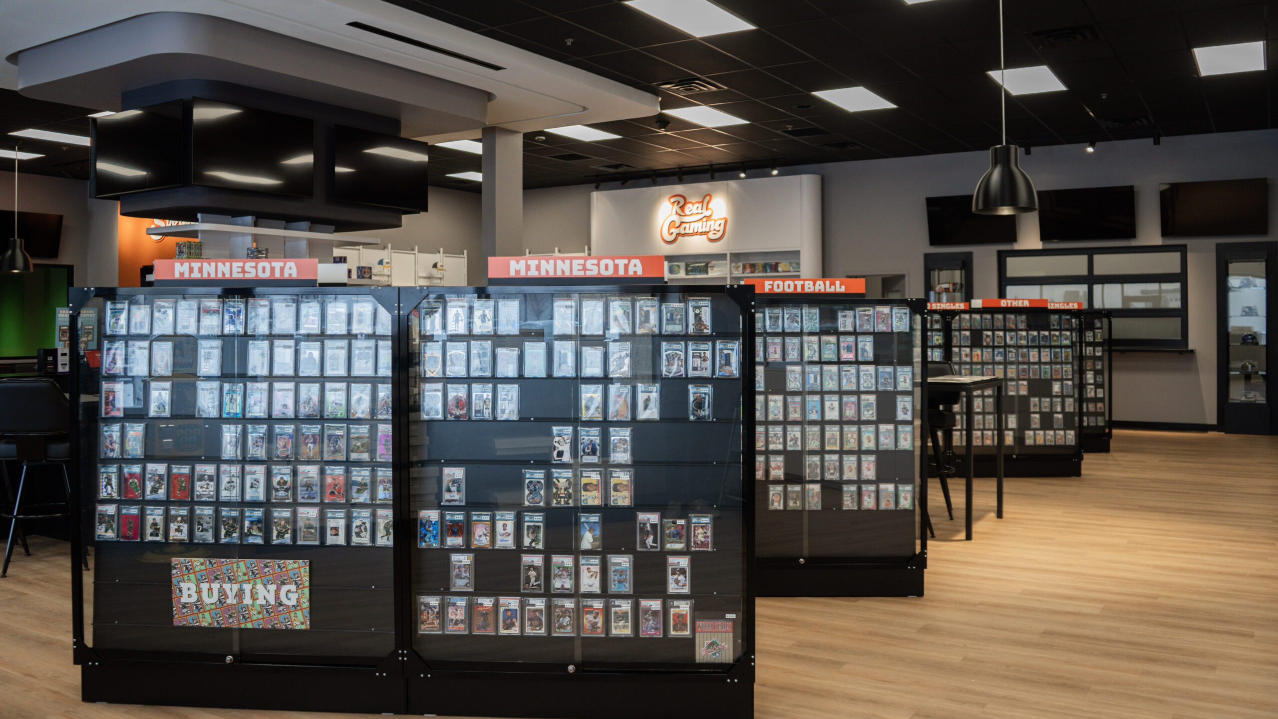 Randahl Construction transformed a 6,787 SF former kickboxing studio into a premier destination for card collectors in Blaine, MN. Our self-performing team delivered a complete commercial remodel for Real Sports Cards featuring custom millwork, including a signature Card Bar with integrated display cases, 70 feet of museum-quality fixtures with LED lighting, and full technology integration with fourteen 4K displays and broadcast studio equipment. From metal stud framing and drywall installation to Sterling Silver walls with Perle Noir ceilings and complete electrical, HVAC, and plumbing systems, every detail was executed to create a welcoming community space. Completed on time and within budget, this project showcases our ability to bring complex visions to life while maintaining the highest standards of craftsmanship and project management.